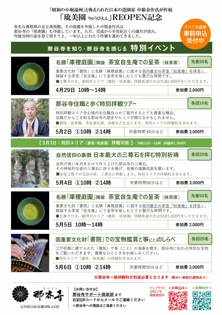 那谷寺を知り・那谷寺を感じる「GW特別体験プログラム」申込受付中 那谷寺では令和8年のGWに特別イベントを行います。テーマは 那谷寺を知り・那谷寺を感じる「GW特別体験プログラム」※すべて事前申し込みを受け付けており、定員に達し次第締め切らせていただきます。 4月29日(祝)10時ー14時名勝「庫裡庭園」隣接茶室自生庵での呈茶(抹茶席) 重要文化財「書院」と名勝「庫裡庭園」に面する県内最古の茶室「如是庵」を拝見し、隣接する茶室「自生庵」にて呈茶を愉しむとても贅沢な時間です。主菓子付き。 参加費:2,000円 (先着50名様) 特別エリア(書院・琉美園)拝観希望の方は別途1,000円をいただきます。 5月2日(土) ①10時 ②14時那谷寺住職と歩く特別拝観ツアー 特別拝観エリア含む境内を住職自らがご案内するとても貴重な機会。住職だからこそ知る那谷寺の歴史やヒミツが聞けるかもしれません。書院・琉美園、奇岩遊仙境、本殿などを巡ります。 参加費:3,000円(先着10名様)特別エリアの拝観料を含みます。 5月3日(土) 特別拝観エリア一般公開 5月3日はイベントはお休み。参拝ご希望の方に公開いたします。 特別エリア拝観料1,000円が必要になります。 5月4日(祝)①10時 ②14時自然信仰の象徴 日本最大の三尊石を拝む特別祈祷 自然が長い年月をかけて作り上げた那谷寺の三尊石。その神秘的な姿の三尊石に祈りを捧げ、皆様の諸願成就を願います。 金堂2階での法話の後、三尊石に移動します。 参加費:3,000円(先着20名様)特別エリアの拝観料を含みます。 5月5日(祝)10時ー14時名勝「庫裡庭園」隣接茶室自生庵での呈茶(抹茶席) 重要文化財「書院」と名勝「庫裡庭園」に面する県内最古の茶室「如是庵」を拝見し、隣接する茶室「自生庵」にて呈茶を愉しむとても贅沢な時間です。主菓子付き。 参加費:2,000円 (先着50名様) 特別エリア(書院・琉美園)拝観希望の方は別途1,000円をいただきま 5月6日(祝)①10時 ②14時国重要文化財「書院」での宝物鑑賞と箏(こと)のしらべ 江戸初期に建てられた「書院」で筝(こと)の演奏を聴き、那谷寺に伝わる特別な宝物をご覧いただきます。優雅なひとときをお愉しみください。 参加費:3,000円(先着20名様)特別エリア(書院・琉美園)の拝観料を含みます。 Tweet Share
