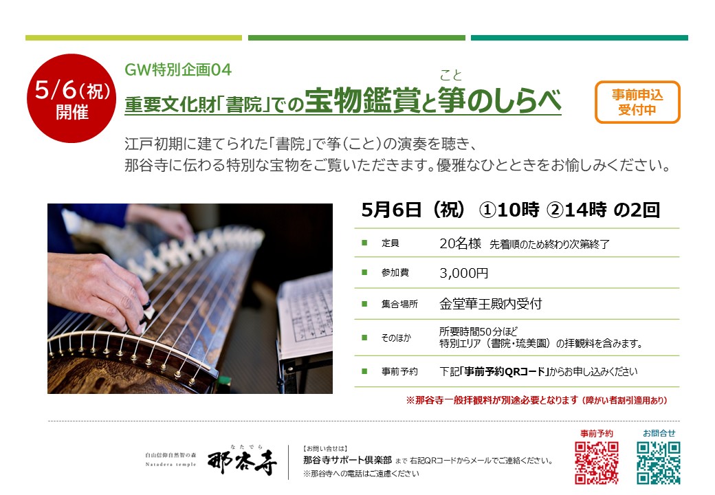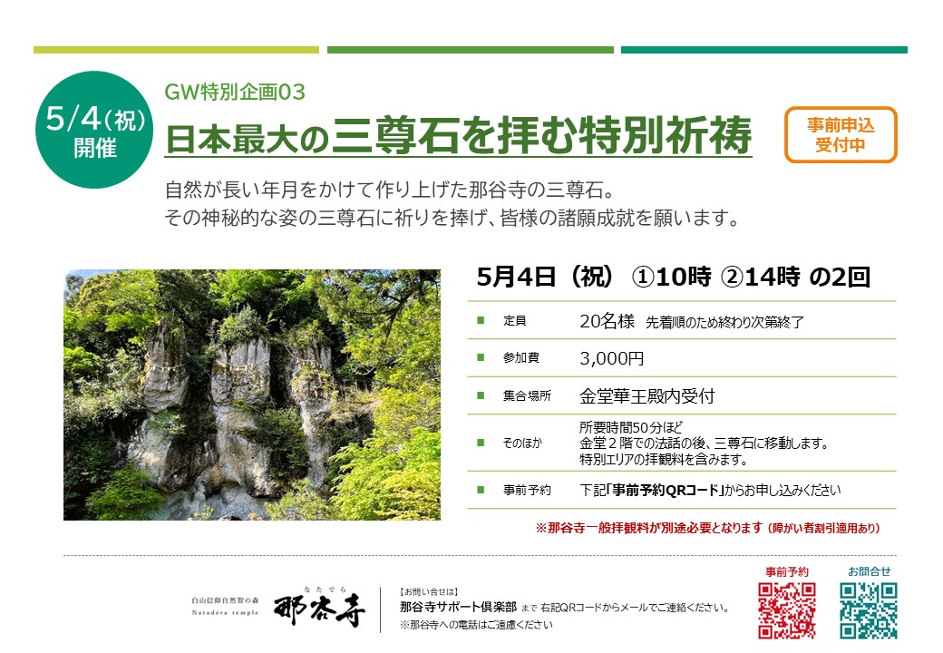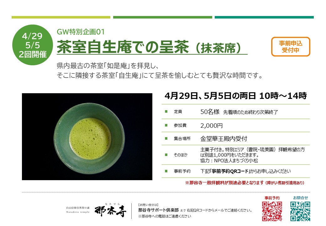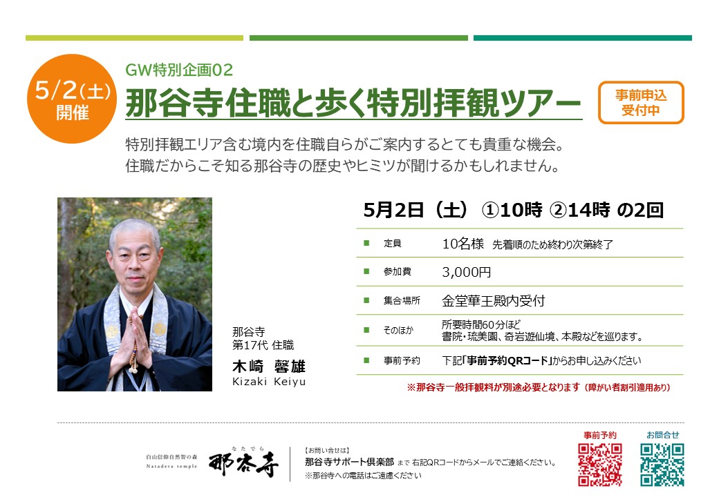 那谷寺を知り・那谷寺を感じる「GW特別体験プログラム」申込受付中 那谷寺では令和8年のGWに特別イベントを行います。テーマは 那谷寺を知り・那谷寺を感じる「GW特別体験プログラム」 ※すべて事前申し込みを受け付けており、定員に達し次第締め切らせていただきます。 各プログラムのお申込みは以下のフォームからご登録ください。 申込フォームはこちらから 4月29日(祝)10時ー14時名勝「庫裡庭園」隣接茶室自生庵での呈茶(抹茶席) 重要文化財「書院」と名勝「庫裡庭園」に面する県内最古の茶室「如是庵」を拝見し、隣接する茶室「自生庵」にて呈茶を愉しむとても贅沢な時間です。主菓子付き。 参加費:2,000円 (先着50名様) 特別エリア(書院・琉美園)拝観希望の方は別途1,000円をいただきます。 5月2日(土) ①10時 ②14時那谷寺住職と歩く特別拝観ツアー 特別拝観エリア含む境内を住職自らがご案内するとても貴重な機会。住職だからこそ知る那谷寺の歴史やヒミツが聞けるかもしれません。書院・琉美園、奇岩遊仙境、本殿などを巡ります。 参加費:3,000円(先着10名様)特別エリアの拝観料を含みます。 5月3日(土) 特別拝観エリア一般公開 5月3日はイベントはお休み。参拝ご希望の方に公開いたします。 特別エリア拝観料1,000円が必要になります。 5月4日(祝)①10時 ②14時自然信仰の象徴 日本最大の三尊石を拝む特別祈祷 自然が長い年月をかけて作り上げた那谷寺の三尊石。その神秘的な姿の三尊石に祈りを捧げ、皆様の諸願成就を願います。 金堂2階での法話の後、三尊石に移動します。 参加費:3,000円(先着20名様)特別エリアの拝観料を含みます。 5月5日(祝)10時ー14時名勝「庫裡庭園」隣接茶室自生庵での呈茶(抹茶席) 重要文化財「書院」と名勝「庫裡庭園」に面する県内最古の茶室「如是庵」を拝見し、隣接する茶室「自生庵」にて呈茶を愉しむとても贅沢な時間です。主菓子付き。 参加費:2,000円 (先着50名様) 特別エリア(書院・琉美園)拝観希望の方は別途1,000円をいただきます。 5月6日(祝)①10時 ②14時国重要文化財「書院」での宝物鑑賞と箏(こと)のしらべ 江戸初期に建てられた「書院」で筝(こと)の演奏を聴き、那谷寺に伝わる特別な宝物をご覧いただきます。優雅なひとときをお愉しみください。 参加費:3,000円(先着20名様)特別エリア(書院・琉美園)の拝観料を含みます。 各プログラムのお申込みは以下のフォームからご登録ください。 申込フォームはこちらから Tweet Share