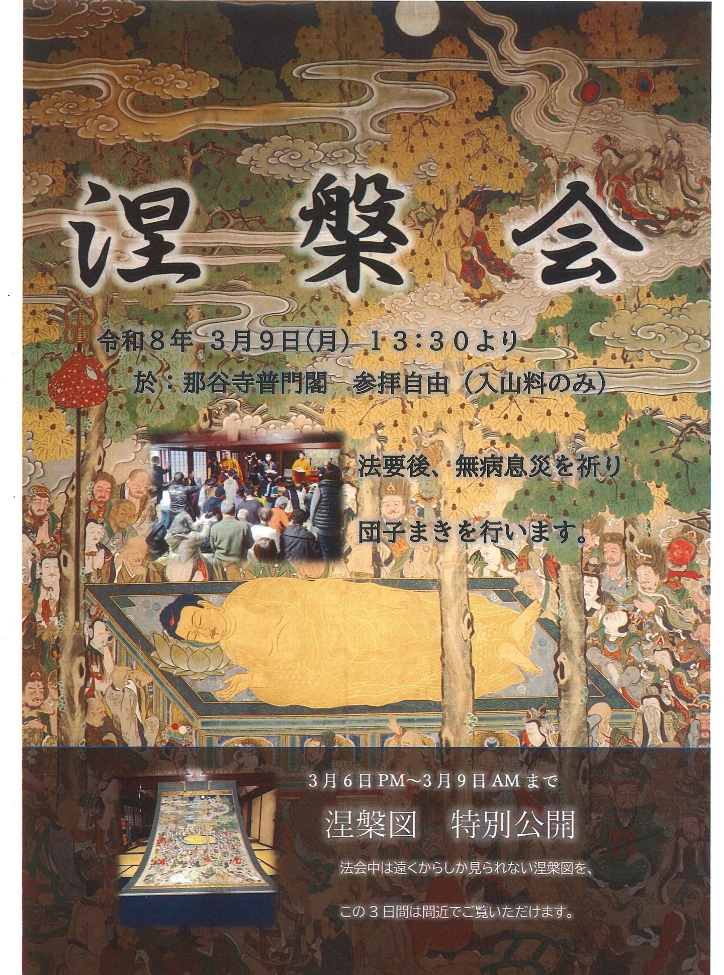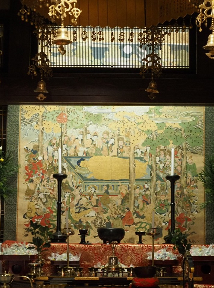 那谷寺「涅槃会」ならびに「仏涅槃図」特別公開のお知らせ 那谷寺「涅槃会」 日時:3月9日(月) 13時30分開始予定 場所:那谷寺 普門閣 料金:無料(那谷寺入場の際、通常拝観料が必要になります) 【涅槃会のお知らせ】 那谷寺では毎年、お釈迦様の遺徳を偲ぶ「涅槃会」を厳修いたしております。 30~40分ほどの法要の後、お釈迦様の遺骨に見立てた五色の団子をまき、皆さまの無病息災を祈念いたします。 那谷寺「仏涅槃図」特別公開 日時:3月6日(金)午後~3月9日(月) 午前中まで ※開門時間内9時15分~16時 場所:那谷寺 普門閣 仏間外陣 料金:無料(通常拝観料で拝観できます) 那谷寺では釈尊の遺徳をしのび涅槃会を毎年行っています。 その際、「仏涅槃図」という仏画を掛けますが、法会中は内陣に掛けることもあり、これまではその姿をよく見ることができませんでした。 大きさは縦3メートル✕横2メートルほどの大画面に描かれている釈尊涅槃 その光景を間近で拝観できるまたとない機会です。この機会にぜひご参拝ください。 Tweet Share