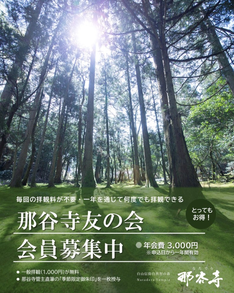 那谷寺・友の会2026 会員募集のお知らせ 年会費をお支払いいただくことで、毎回の拝観料が無料となる「那谷寺友の会」の会員を募集いたします。 定期的な参拝や・四季折々の景色や花の鑑賞、運動がてらに広い境内を歩き、心もからだも健康になりたい方、木々や苔に包まれての森林浴や癒し、写真の愛好家の方 などにおすすめです。 1.「那谷寺友の会」会員様の特典 ・一般拝観料(通常1,000円)が無料になります。 ・会員期間中は何度でも無料でお入りいただけます ・季節限定の特別御朱印を年に1枚お渡しします。 ご入会時に引換券をお渡しします。 2.会員の期間 ・お申込み日から一年間(2025年度よりお申込み日から一年間に変更。さらにお得になりました) 3.年会費 ・3,000円(消費税は必要ありません) 4.お申込み方法 ・那谷寺の受付でお申し込みください 5.注意点 ・ご利用は氏名記載の方、1名のみとさせていただき、ほかの方への譲渡等はご遠慮ください。 Tweet Share